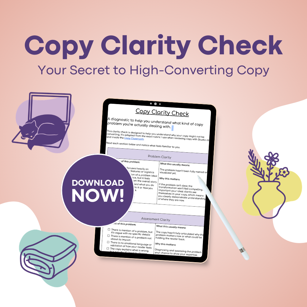 Not sure why your copy isn't converting? The Copy Clarity Check helps you pinpoint exactly where your messaging is falling flat — so you know what to fix before you lose another potential client.